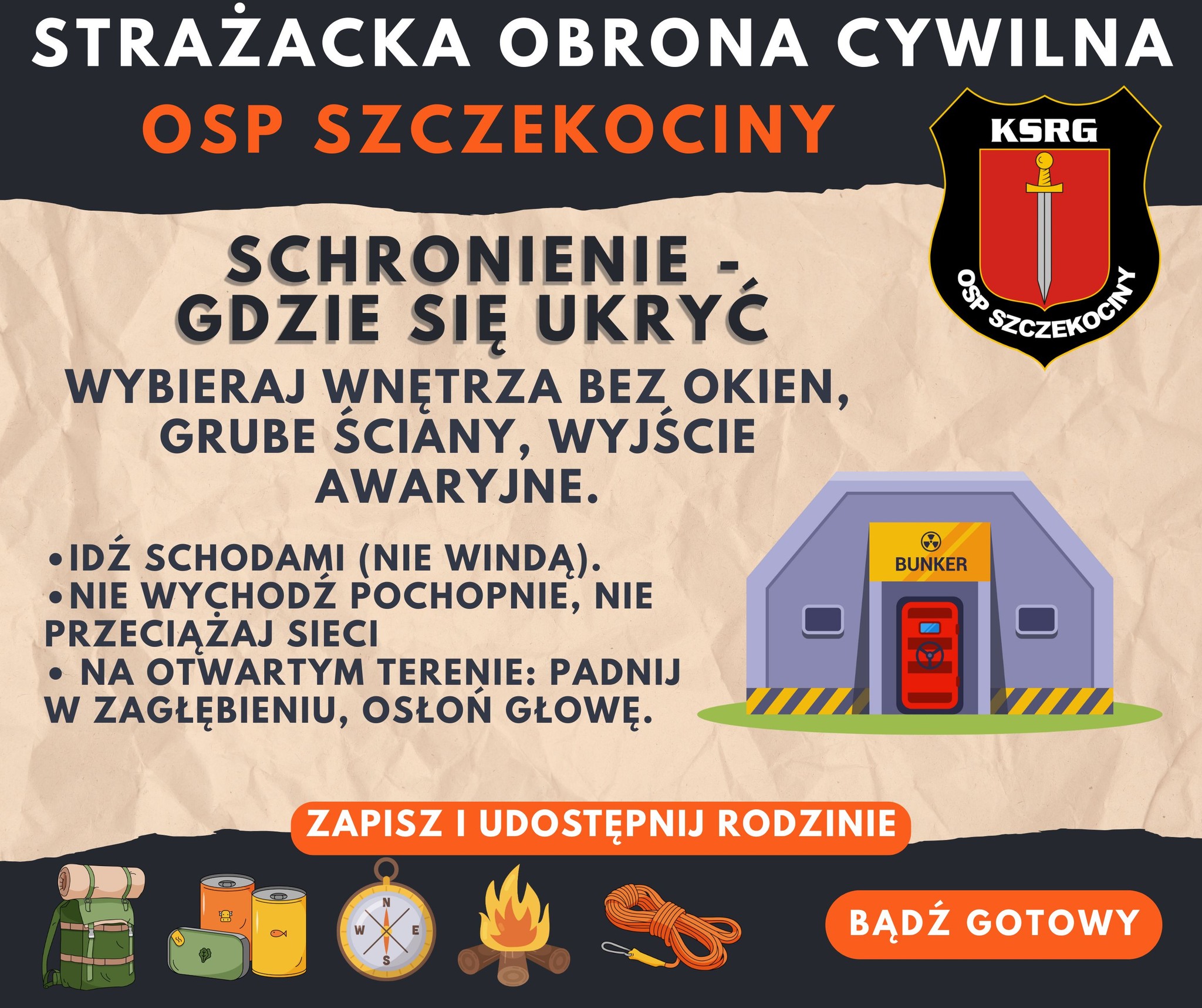 Gdzie się kierować?W pierwszej kolejności do wyznaczonych miejsc schronienia wskazanych przez gminę/PSP/OSP (informacje na stronach urzędu i w komunikatach).